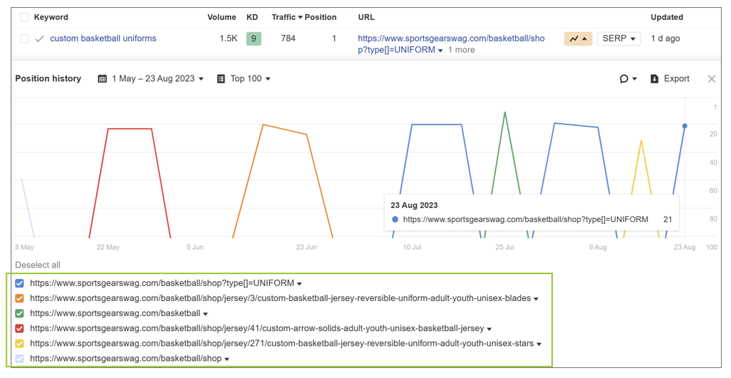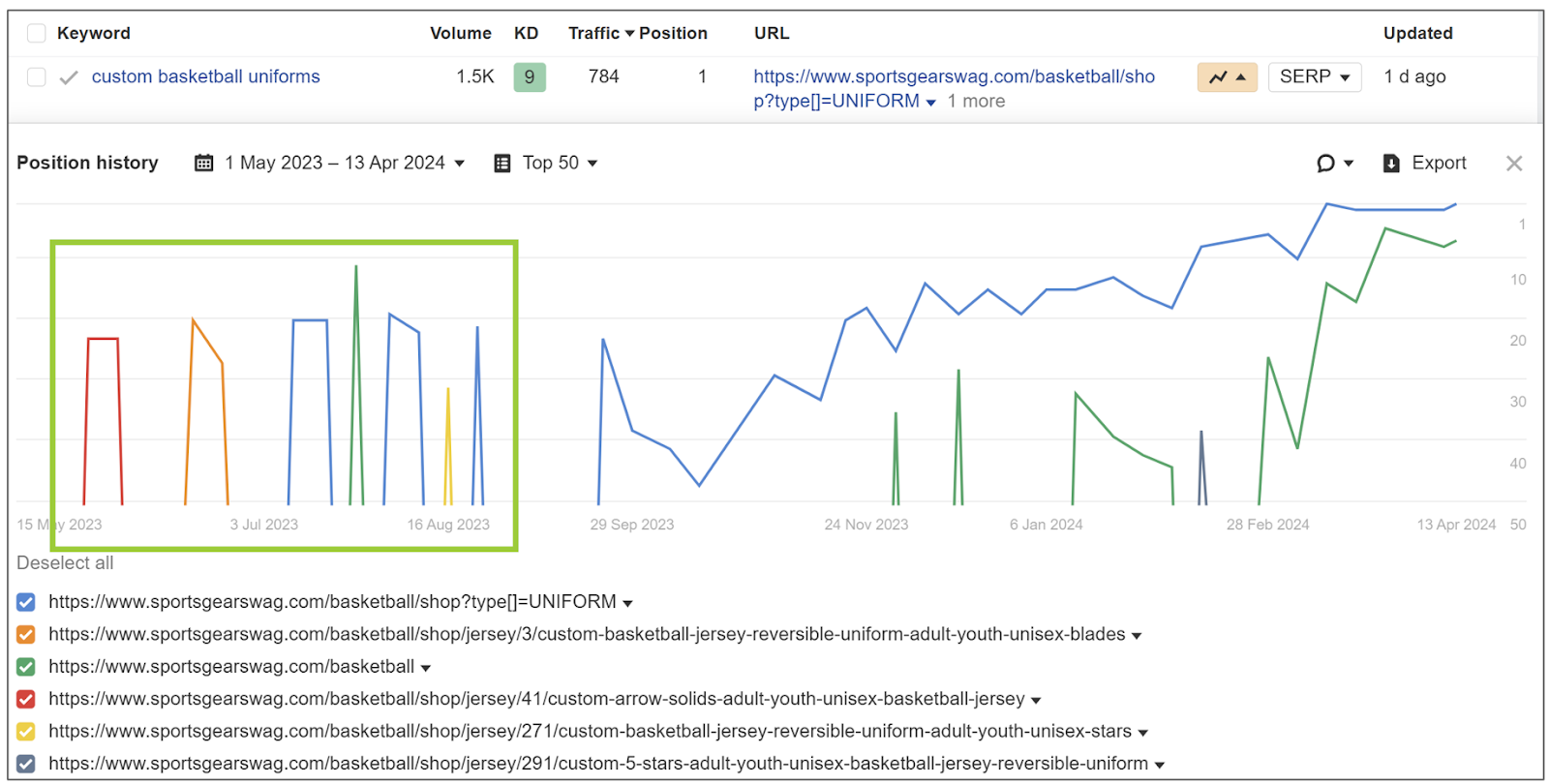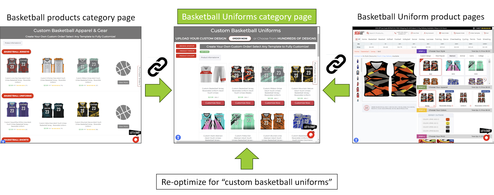 A case study with Sports Gear Swag illustrates this problem perfectly. They had three different types of pages that could potentially rank for “custom basketball uniforms”: