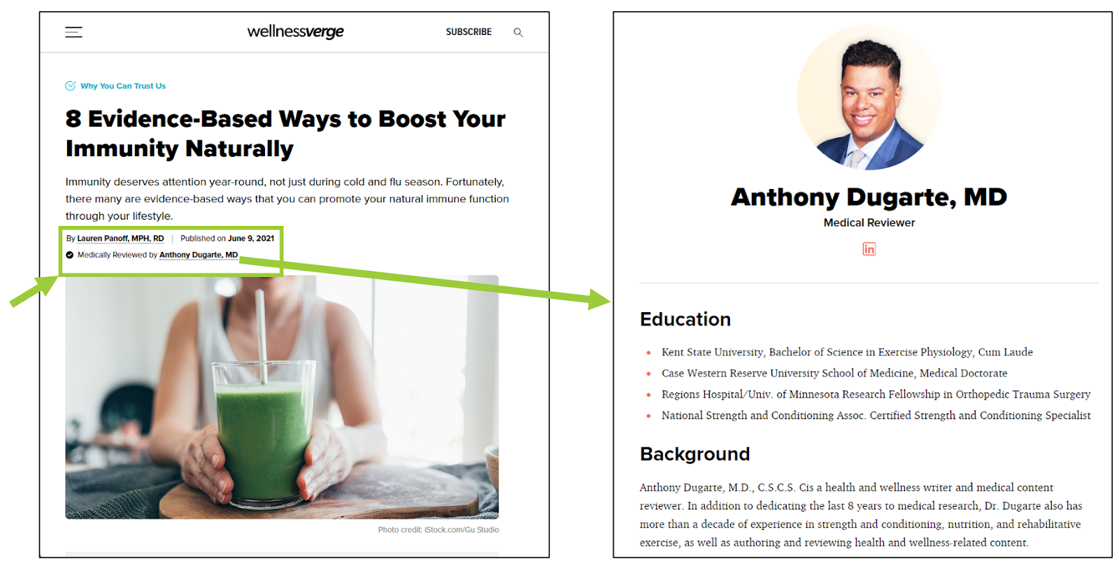 Wellness Verge exemplifies this approach. Every piece of content on their site identifies both the author and a credentialed reviewer, with detailed profiles available for each.
