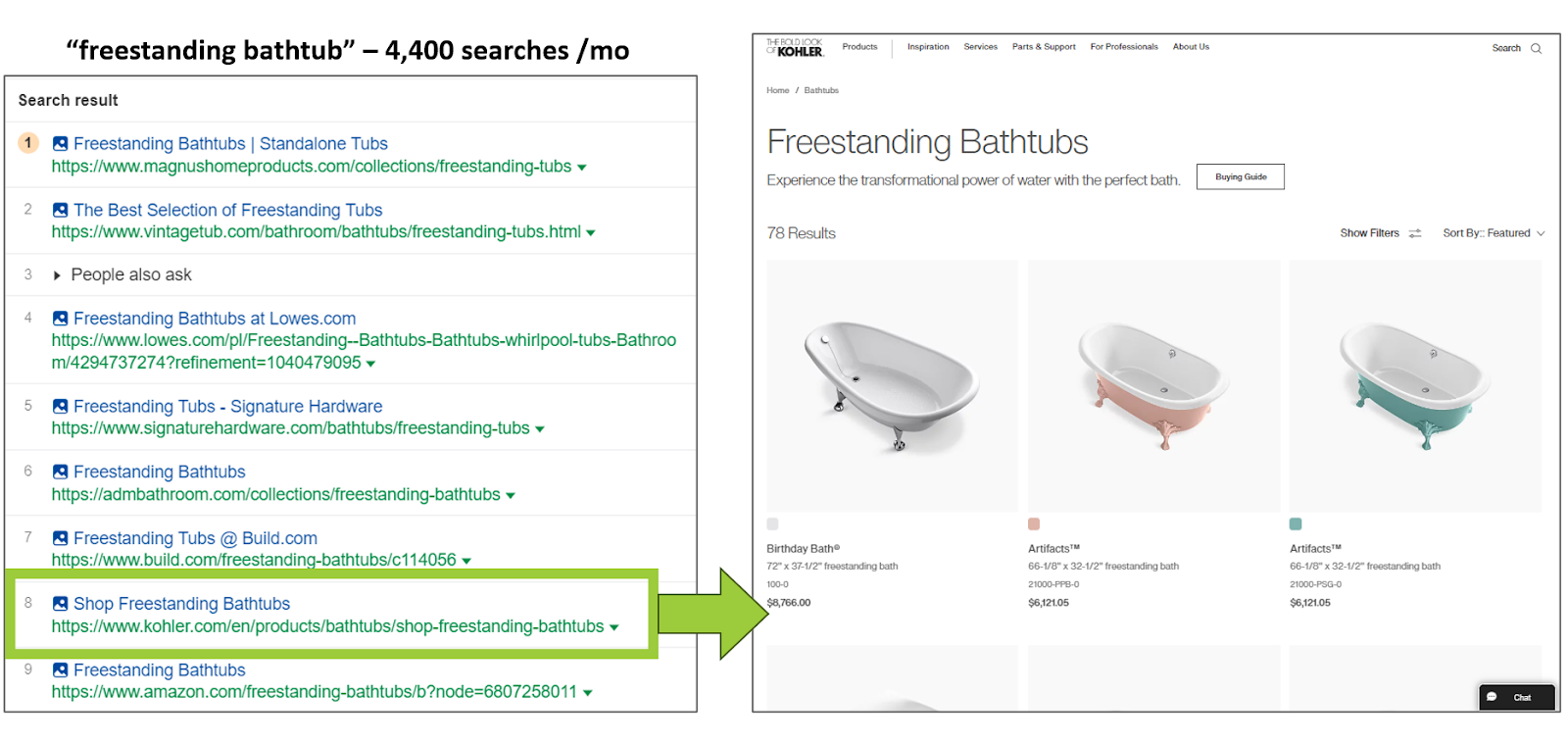 Consider this real example: For the keyword “freestanding bathtub” (4,400 monthly searches), a major brand like Kohler ranks only in position #8.