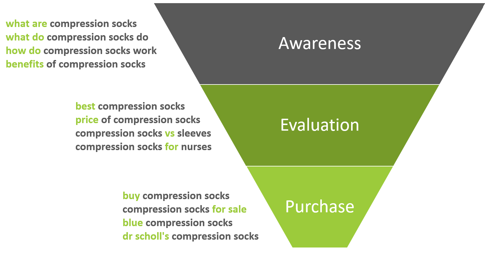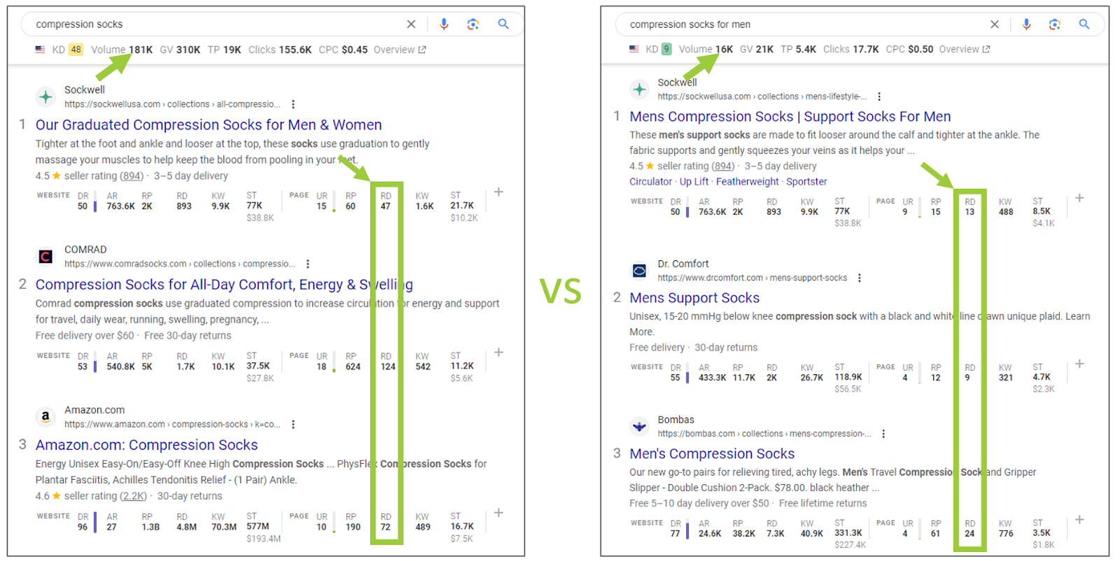 The keyword “compression socks” has 10x more search volume than “compression socks for men”. Many business owners will put too much focus on search volume and go all in on the keywords with the most search volume.