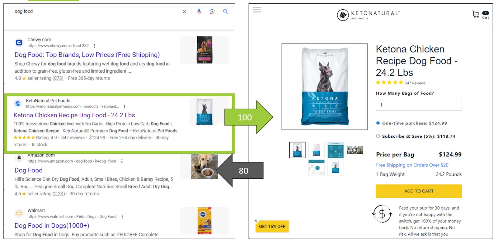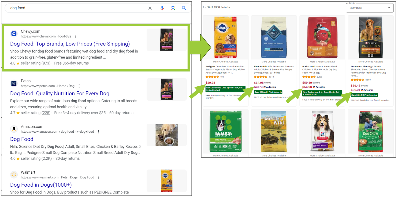 When we look at sites ranking on page one for “dog food,” we see lower cost product offerings products ranging between $30-60