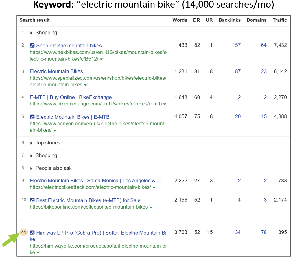 Consider Himiway, an e-commerce site selling electric bikes. They wanted to rank for “electric mountain bikes” and focused their efforts on optimizing a product page for this term—building an impressive 78 backlinks to it over time.