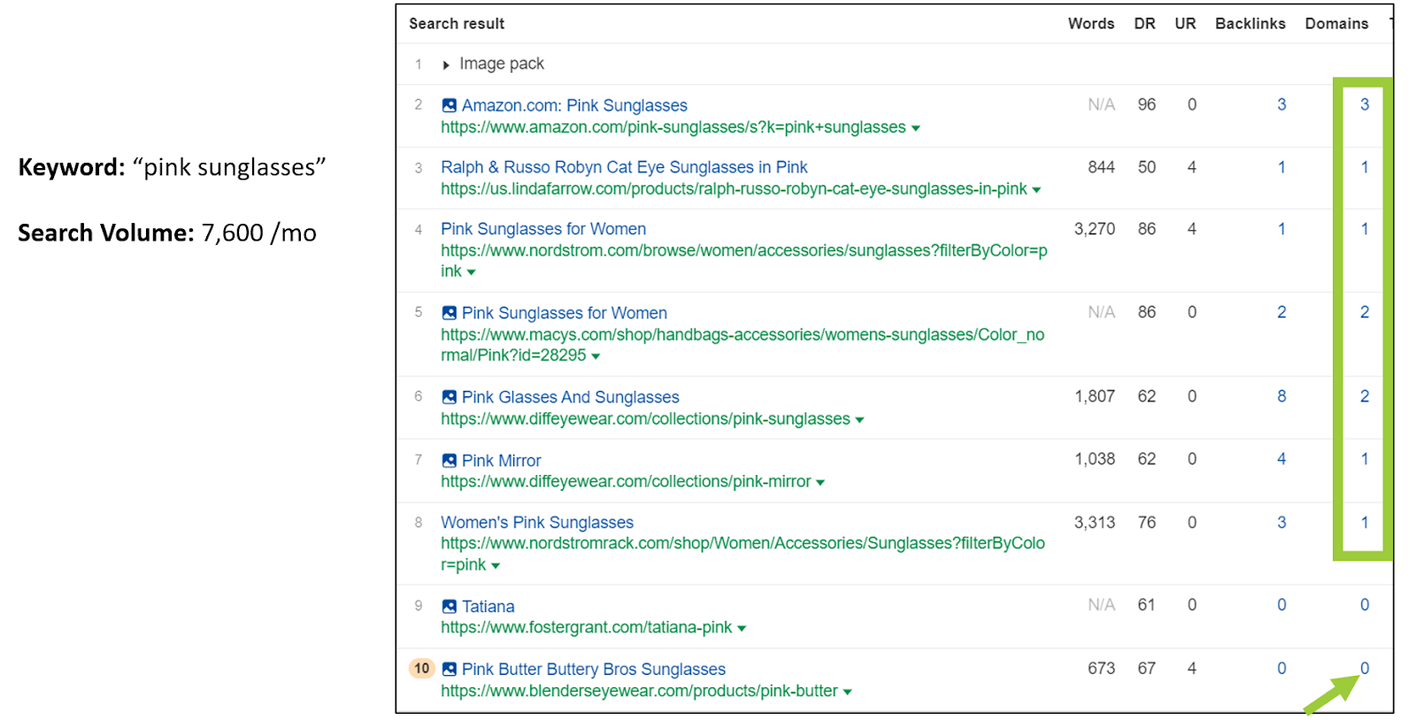 For example, the keyword “pink sunglasses” (7,600 monthly searches) shows that all top-ranking pages have between 1-3 backlinks. Meanwhile, brands like Blenders Eyewear and Forest Grant rank at the bottom of page one with zero backlinks.