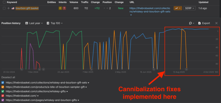 So to fix this, we re-optimized the Whiskey and Bourbon Gift Sets collection page and added internal links from the other pages that were incorrectly ranking. We also made sure to use the exact-match keyword “bourbon gift basket” in the anchor text to make it clear that it was the correct page for the keyword.