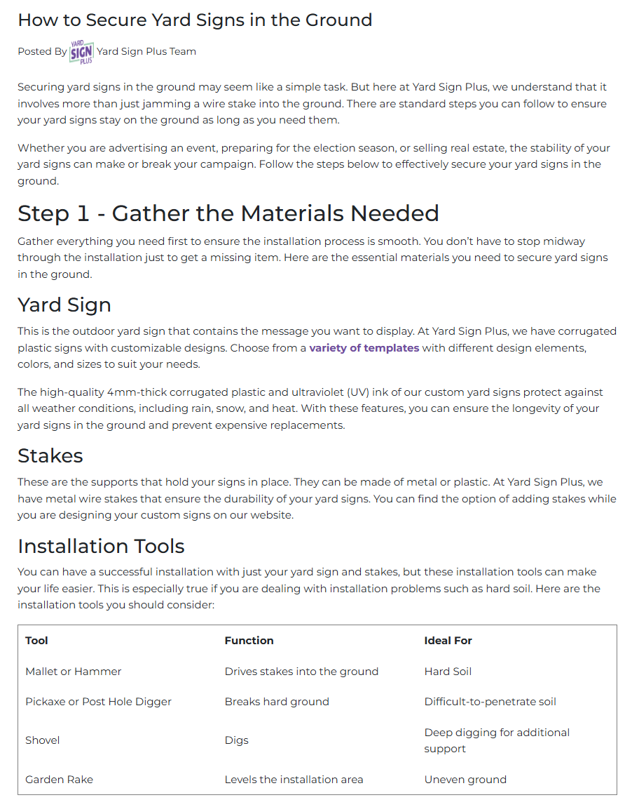 We published detailed guides on topics like yard sign design, material selection, and installation tips to establish topical authority.